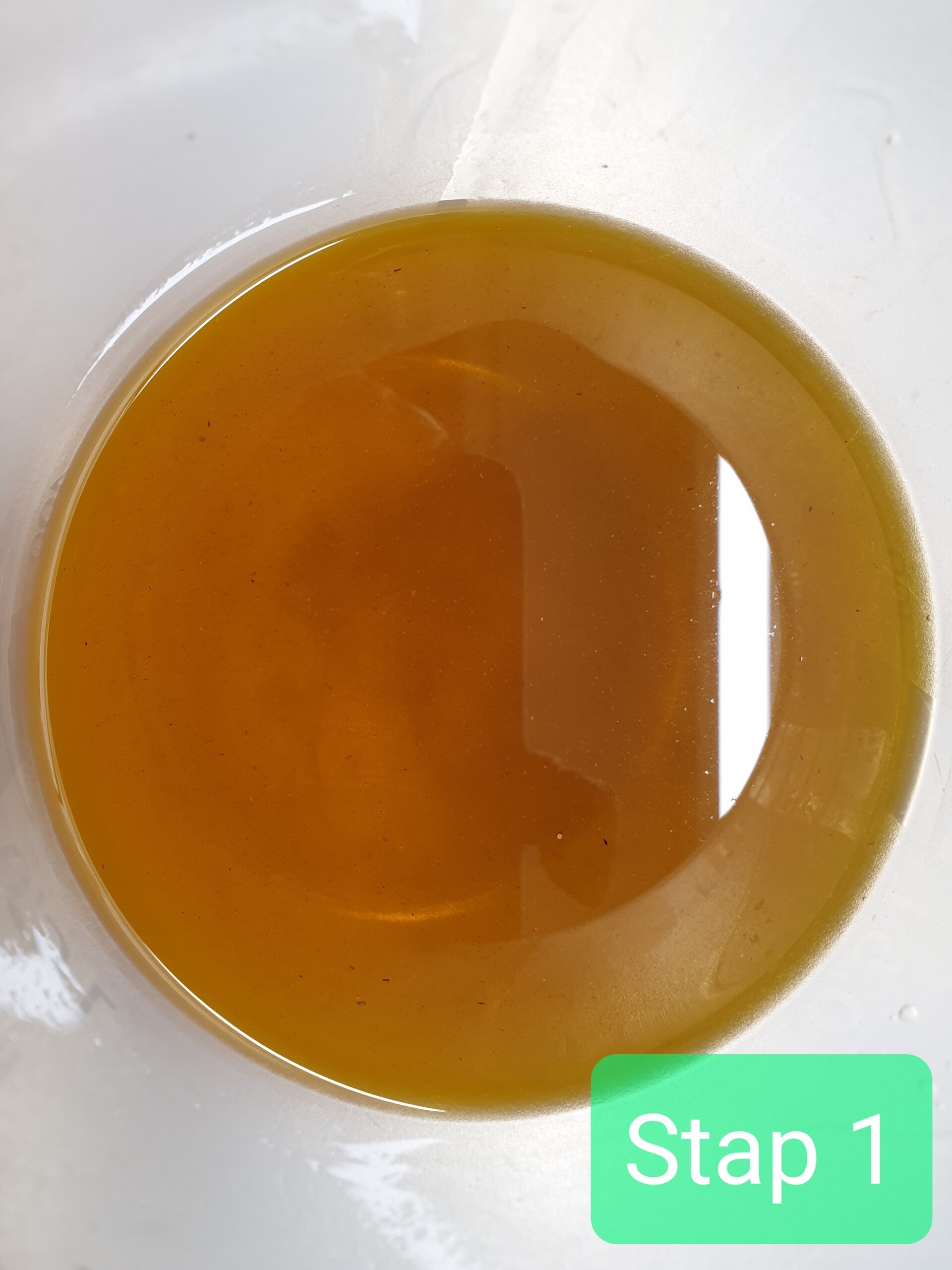 Stap 1: de bloemen zijn uit de olie gefilterd en de olie wordt gecontroleerd op helderheid