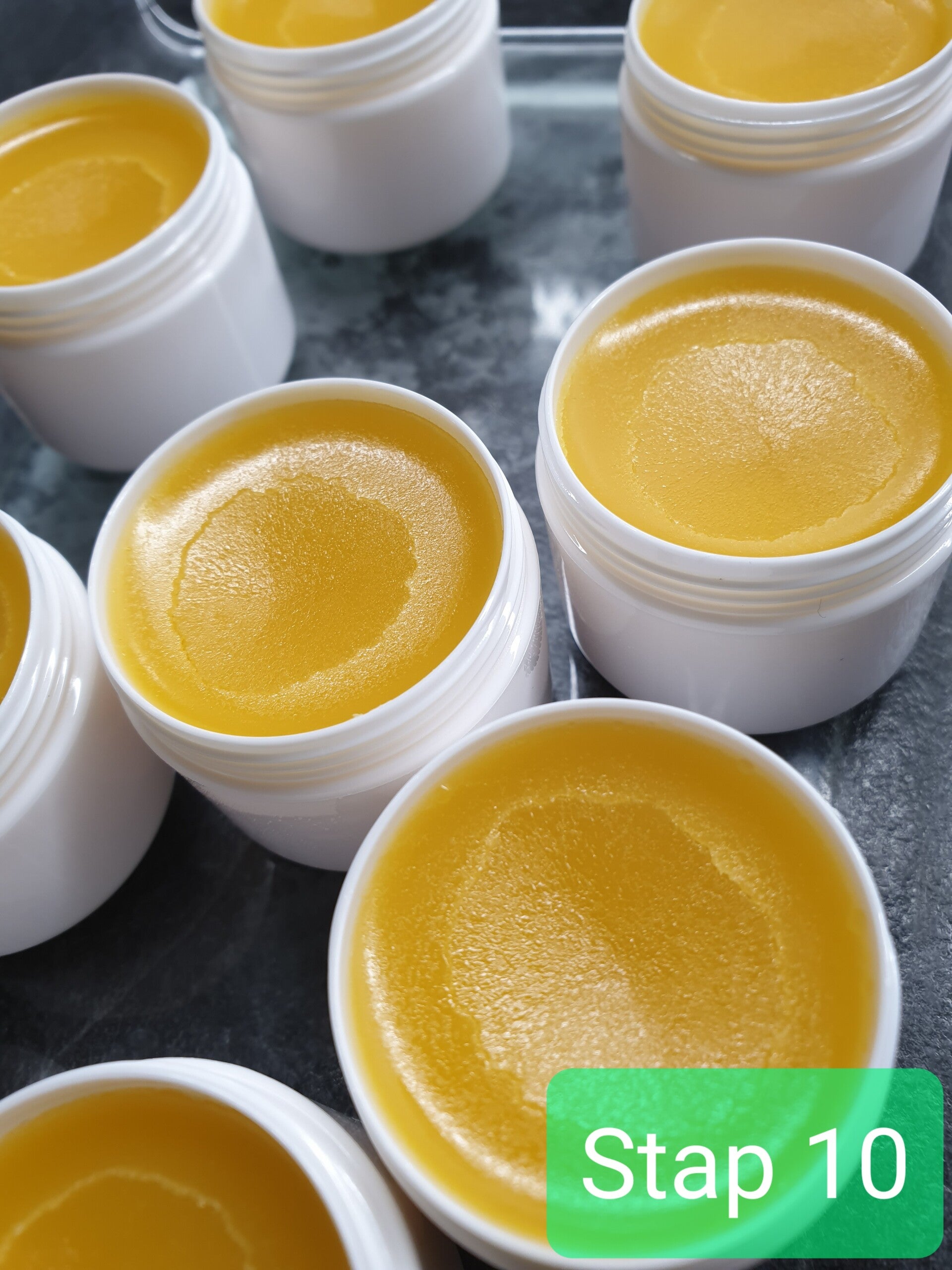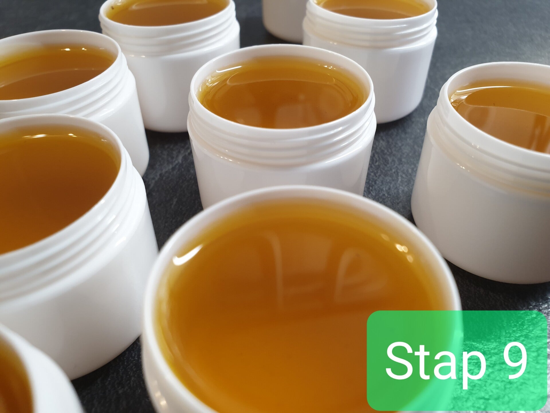 - de zalf is nu nog vloeibaar, doordat hij opgewarmd is. Tijdens het afkoelen stolt de zalf en vormt het zijn eigen unieke structuur.
