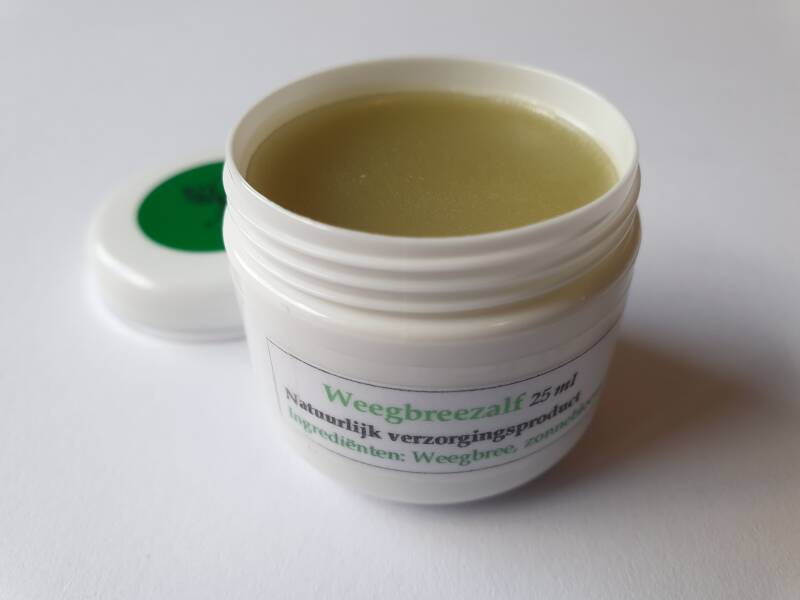 Weegbreezalf bestaat uit puur natuurlijke producten met als hoofdbestanddeel - Weegbreeblad -